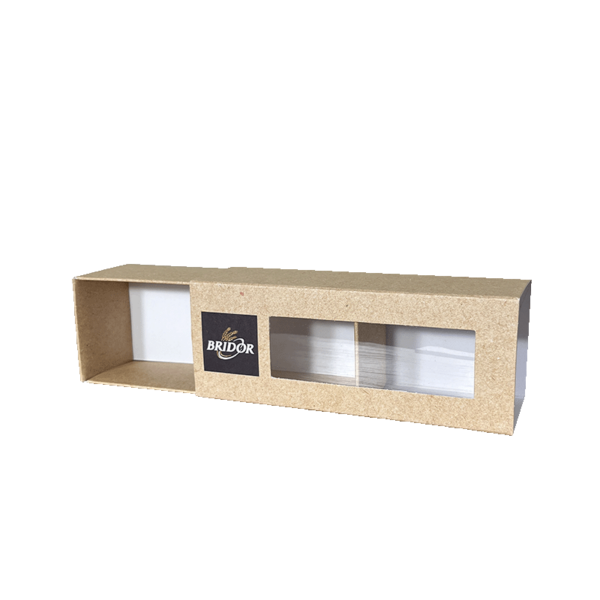 Cette boîte à fourreau à l’image de Bridor est conçue pour l’emballage de produits alimentaires. Il s’agit d’une boite kraft personnalisé dotée d’une fenêtre transparente qui permet de visualiser le contenu tout en le protégeant. De plus, le système à fourreau offre une ouverture facile aux deux extrémités. Le design épuré et fonctionnel reflète un engagement envers la durabilité et la qualité. Idéale pour les pâtisseries, cette boîte offre une présentation élégante et pratique pour la clientèle du groupe Bridor.